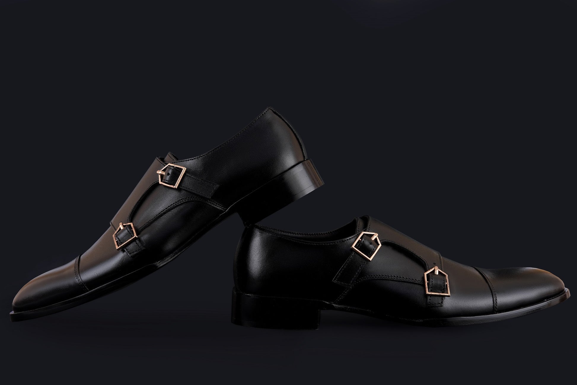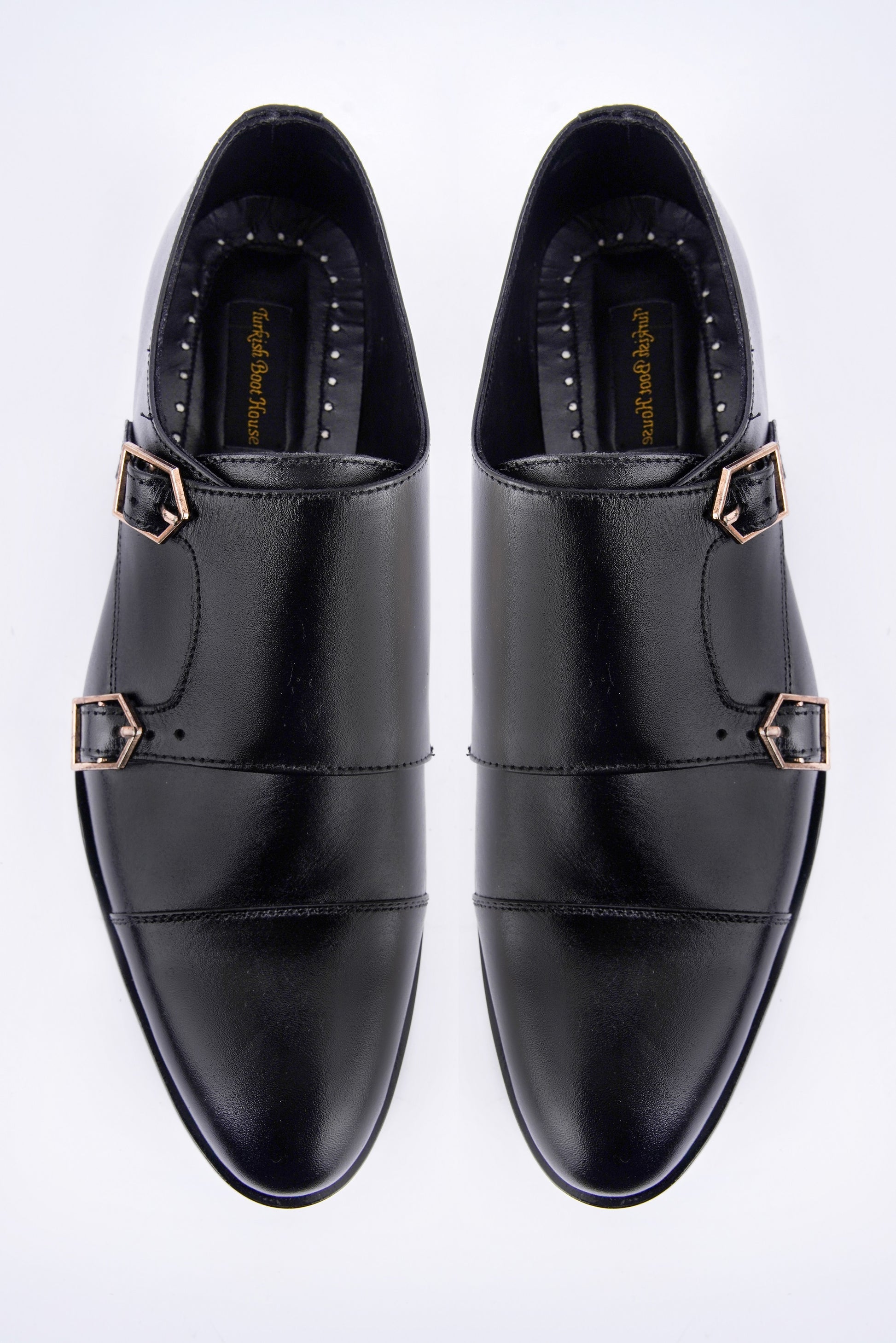 Sleek black leather dress shoes featuring a classic double monk strap design with metal buckles. Clean stitching and a smooth finish give them a polished, formal look suitable for business or special occasions.