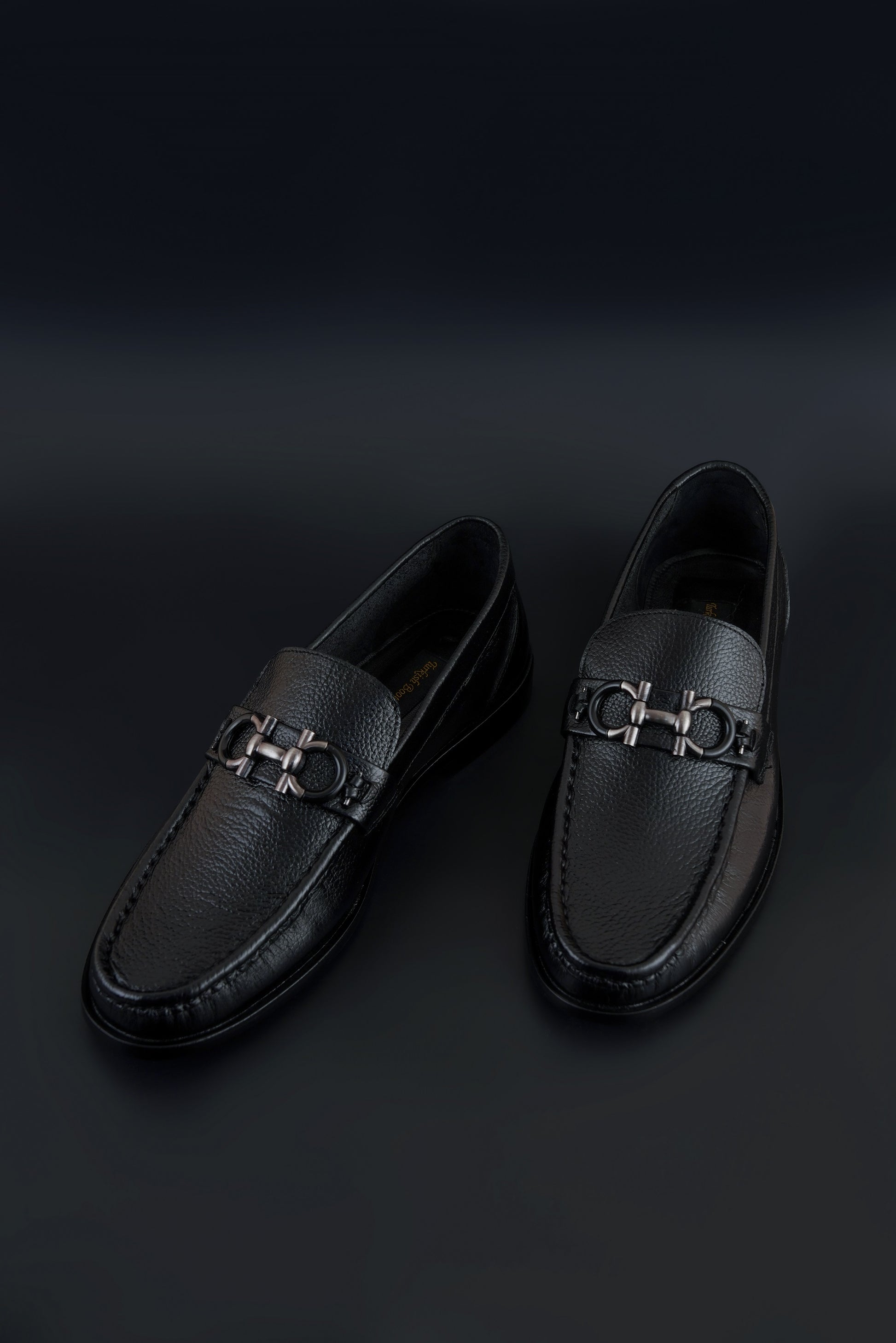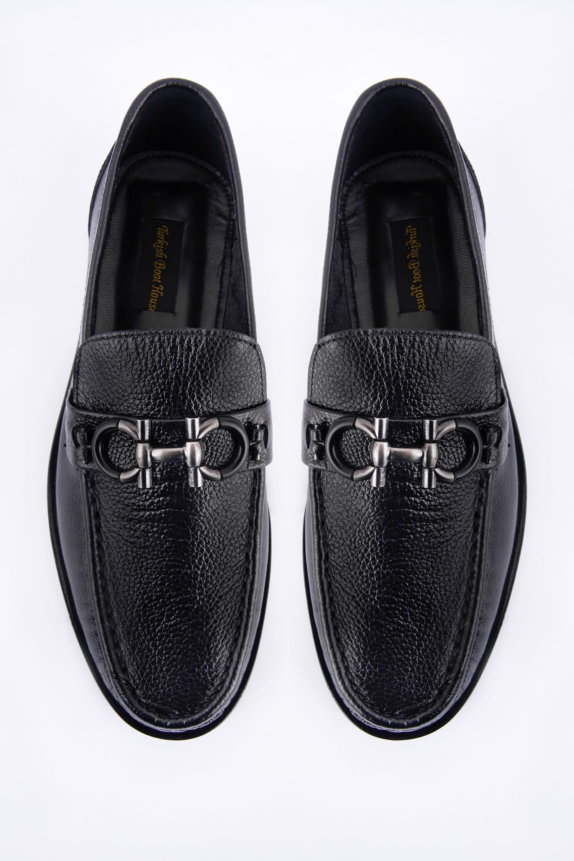 Classic black leather loafers with a textured finish and sleek metal horsebit detail, suitable for formal and smart-casual wear.