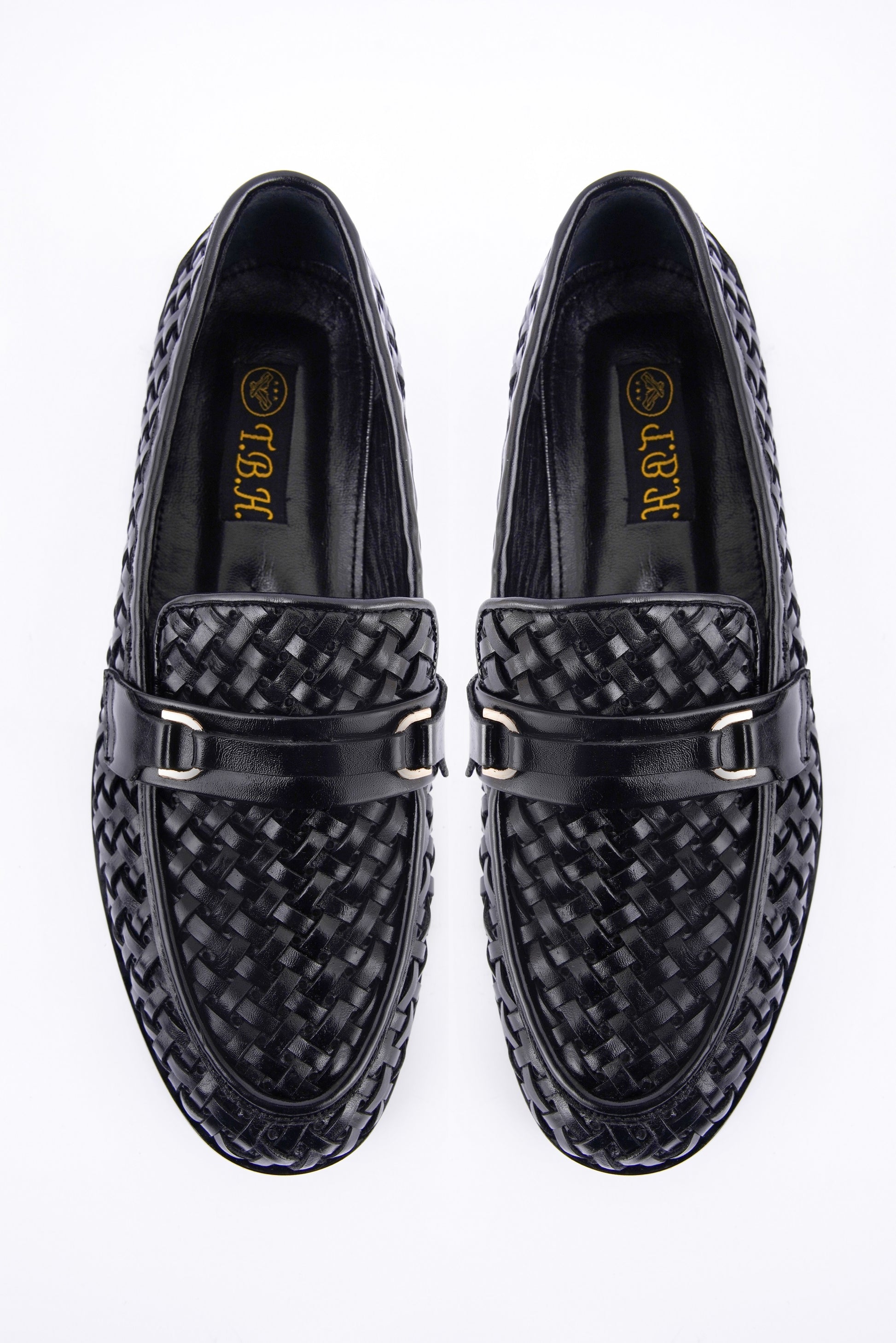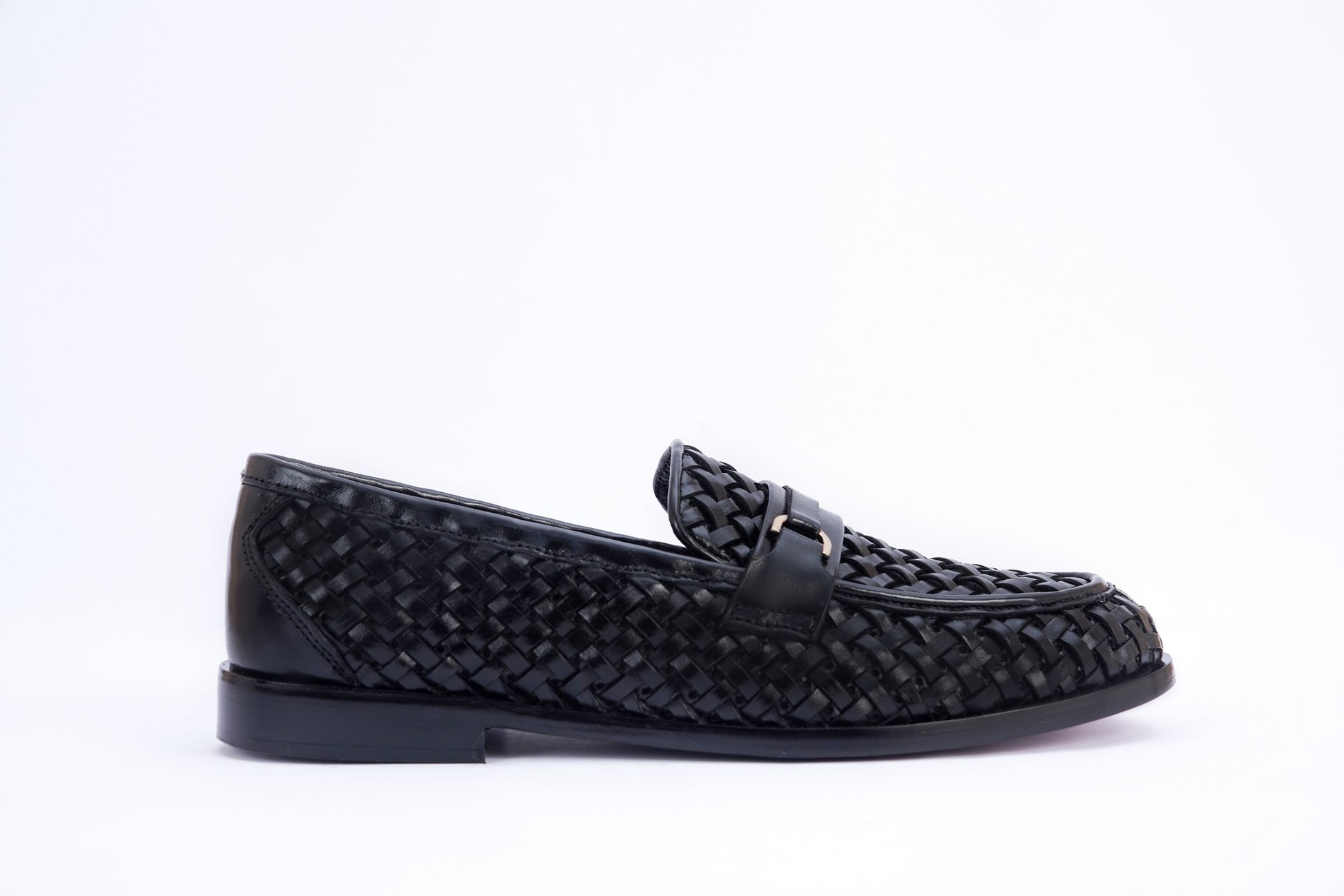 Elegant black formal crafted with a woven leather upper and a sleek metal accent across the vamp. The textured design adds a modern, stylish touch while maintaining a classic silhouette.